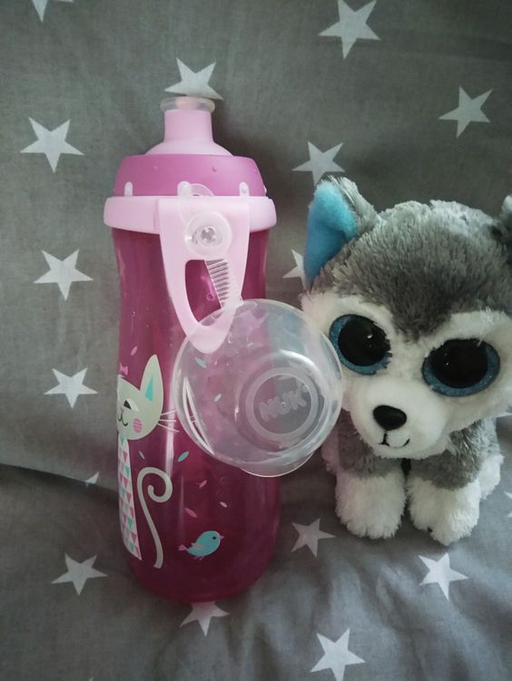 Bidon posiada klips dzięki któremu możemy przyczepić go do plecaka mojej przedszkolanki. Przeznaczony jest dla dzieci powyżej 3 lat. Jego kształt ładnie dostosowuje się do małych rączek. Nawet podczas zabawy dziecko może po niego sięgnąć i z łatwością jedną rączką napić się. Dodatkowe zabezpieczenie w postaci nakrętki chroni nasz napój przed zanieczyszczeniami.  Silikonowy ustnik możenie jest łatwy do wyciągnięcia przez dziecko, ale z czasem córeczka dochodzi do wprawy i udaje jej się otworzyć.  Jeśli z czasem ustnik się wyrobi lub tak jak moja księżniczka to robi, zostanie pogryziony możemy dokupić nowy i z łatwością wymienić. Można myć go w zmywarce.  Na razie podczas mycia nie zauważyłam aby obrazki na bidonie zmywały się.