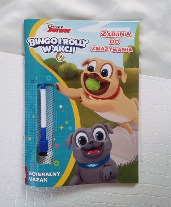 Pieski, a raczej bajkę o dwóch małych mopsiakach moje dzieci bardzo lubią. Kiedy okazało się że są książeczki z Bingo i Rolly’m musieliśmy mieć choć jedną. Książeczka zadania do zmazywania to propozycja od Wydawnictwa AMEET.