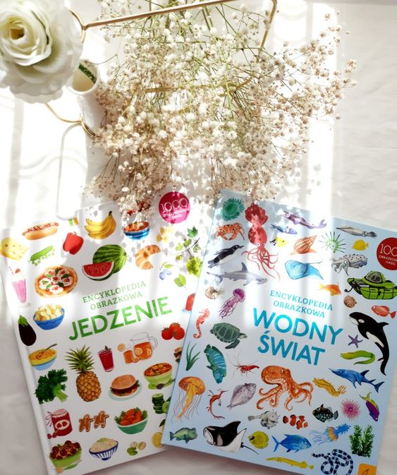 Encyklopedia obrazkowa to swego rodzaju słowniki gdzie poznajemy nowe wyrazy. Każda z książka wydana jest w dużym formacie. W środku każdej z nich znajdziemy 1000 haseł związanych z wodnym światem oraz jedzeniem.